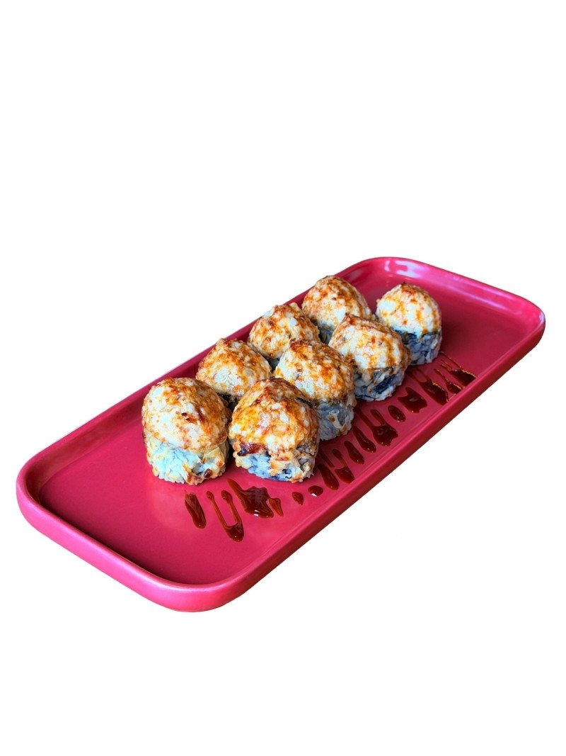 Рис ,нори, сыр творожный, омлет ,кляр фритюр, майонез, жареная курица, угорь копченный, соус унаги, икра тобико.